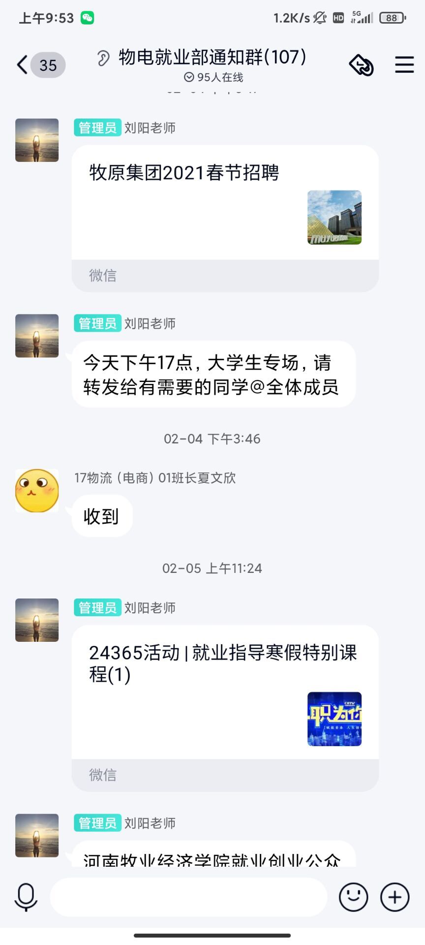 首先企业下达招聘信息后,由我院工作人员接收整理并发布于77779193永利官网就业通知群中,2月份推送有牧原集团、跟谁学小早启蒙、高徒课堂以及郑州市卓轩电子科技有限公司等优秀企业的2021春季招聘信息,并依次发布介绍了企业的人才发展方向、工作要求、福利待遇等信息。在接收到招聘信息后,毕业生们根据自我定位以及薪资福利等自主选择招聘群进行进一步咨询了解。除此之外,就业专员刘阳老师对招聘信息进行审核筛选,以便帮助同学们进一步明晰行业的就业优势以及未来努力的方向,并在QQ,微信以及就业通知群中热情回答了同学们对就业创业等方面提出的疑惑问题。此次二月份发布的企业招聘信息给我院毕业生提供了大量优质岗位,彰显了我院就业工作在假期期间也不放松,依旧提供优质的就业信息,完善提高就业服务的工作态度。同时,我院就业专员通过不断转发一些优质实用的面试技巧,怎样提升简历撰写能力吸引面试官眼球,明晰自我就业方向以及奋斗目标等相关资讯以及信息来帮助毕业生提高在面试等环节的通过率。