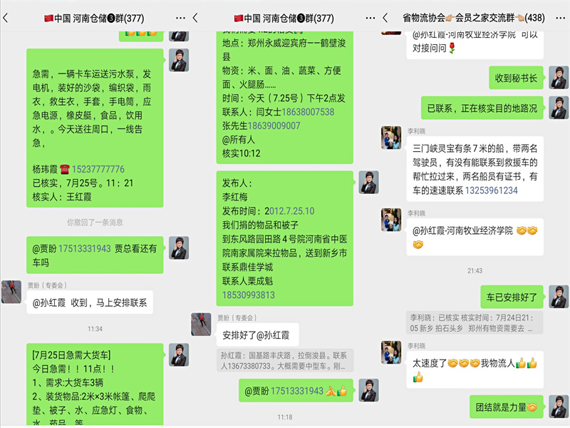 洪灾前,李利晓老师和孩子就已身在外地,看到郑州受灾,朋友圈和微信群里发的洪灾信息,却帮不上忙,心痛不已。当她了解到自己的老师能够对接物资车,就及时将需要运输车的消息转发给了河南省物流协会的秘书长李霞,由她转发至群中。就这样许多信息很快对接成功,李老师非常开心,立刻向群中分享能够对接救灾物资运输车的消息。同时,李利晓老师还加入了郑州市惠济志愿者群、同学组织的捐赠队群、物流协会群、冷链抗灾工作物流群等等。她表示,每当大家有需求,将信息发至群中或私聊她时,她都很热心帮助每一位求助者。李老师说:“咱们物流人有大爱,都能快速对接成功,把物资及时准确地送达目的地。尤其有一车医疗物资,负责人能够在群里自动对接到一辆冷藏车,专业又高效”。虽然李老师因火车停运无法归家,但她的爱心和热情已经传递在灾区的数个角落。