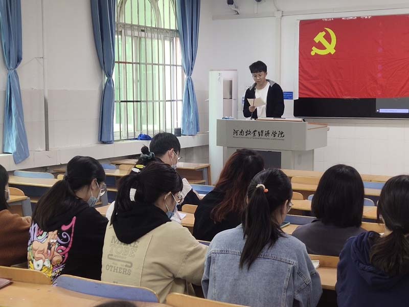 活动开始,由学生第二党支部书记刘阳老师发表讲话,阐述政治理论学习对党支部和党员发展的重要性,并带领学生们共同学习本次政治理论学习活动的内容。她指出本次学习活动的目的在于通过对习近平总书记讲话的内容教育学生党员们跟上时代发展潮流,建立思想的前瞻性和先进性,建立对我们国家政治制度和社会制度发展的历史认同和政治认同。接下来,刘阳老师鼓励学生党员们积极提出对于政治理论学习后的见解,学生党员们踊跃上台发表自己的看法,认为应该通过不断地学习来提高自己的认识。党员们一一发言之后,刘阳老师对党员们的发言进行了评价,并提出了自己的殷切希望,教导学生党员们要肩负起自己作为一名党员的责任和义务,促成了本次政治理论学习活动圆满结束。