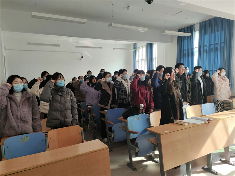会议伊始,全体人员起立,奏唱国歌。随后,讨论党员发展对象的发展问题,党员发展对象在支部大会上宣读了本人转预备申请书,汇报对党的认识、入党动机、本人履历、家庭和主要社会关系。发展对象表示不仅要在行动上入党,更要在思想上入党,向支部大会表达了自己强烈的入党愿望。汇报过后,由老师、同学对发展对象进行民主评议,最后由正式党员对发展对象是否发展成为中共预备党员进行无记名投票表决。最后,经支部大会表决,杨睿飒、王雯恬等19名发展对象成功发展成为中共预备党员。随后,支部书记尚津老师进行讲话,对杨睿飒、王雯恬等19名新发展的预备党员进行祝贺,并表达了对新发展预备党员的期许,希望新发展预备党员能积极学习习近平新时代中国特色社会主义思想,严格要求自己,发挥党员的先锋模范作用,努力成为一名优秀的党员。会议最后,学生第一党支部全体在校生党员和新发展的预备党员起立,宣读入党誓词。