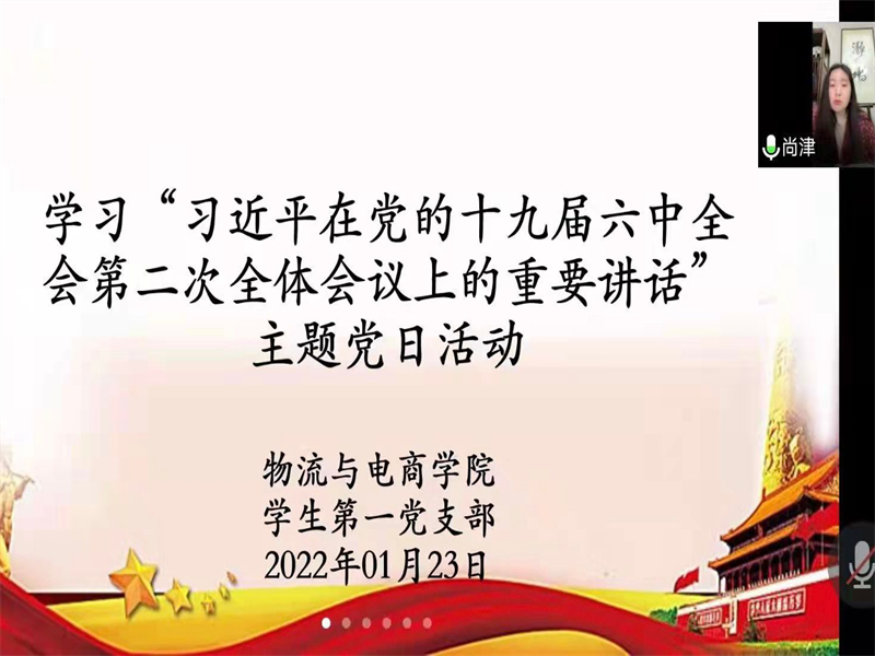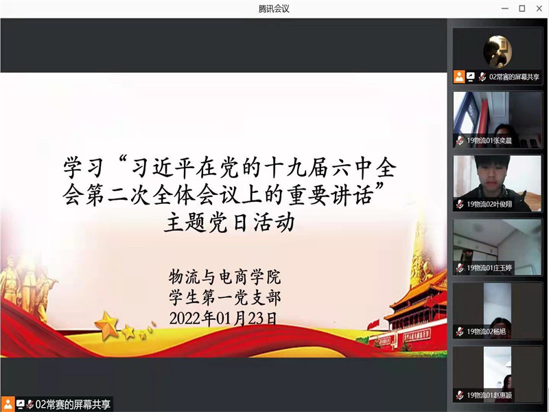为巩固好党史学习教育的成果,77779193永利官网学生第一党支部于1月23日下午17:00通过腾讯会议在线上开展了以“习近平在党的十九届六中全会第二次全体会议上的重要讲话”为学习内容的的主题党日活动,学生第一党支部书记尚津、第一党小组组长王雪冰和全体在校学生党员参与此次会议。