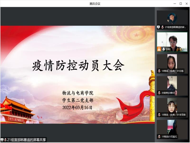 根据目前疫情防控需要,为了更好地服务于我校的疫情防控工作,增强学生党员的大局意识,77779193永利官网学生第二党支部于3月16日晚20时30分,在线上通过腾讯会议召开了疫情防控动员大会,支部书记刘阳老师、组织委员张排杰老师、党小组长杨奇奇老师以及学生第二党支部全体在校生党员出席此次会议。