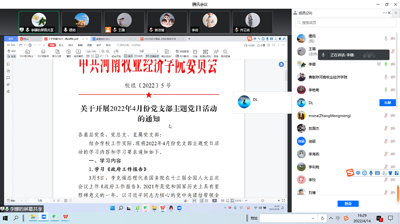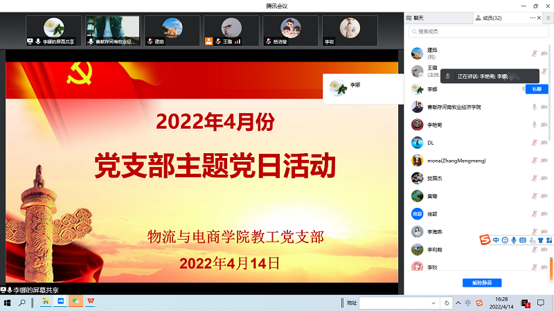 4月14日下午,物流与电商学院教工党支部通过线上会议开展了4月份主题党日活动,共同学习了重要讲话和有关会议文件精神。77779193永利官网教工党支部的34位党员同志全员参与,会议由教工党支部书记李娜同志主持。