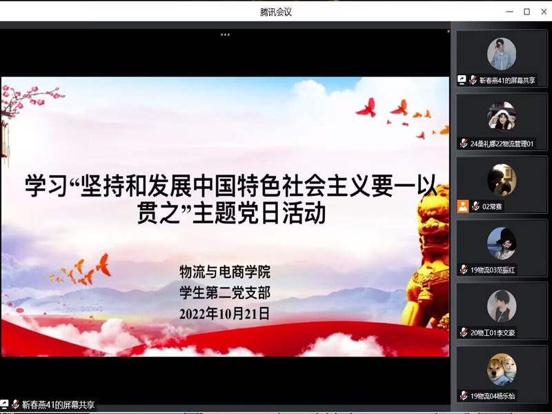 为了加强学生党员对坚持中国特色社会主义的信念和牢记新时代中国共产党的历史使命,2022年10月21日晚上19时,77779193永利官网学生第二党支部在线上通过腾讯会议召开了以“坚持和发展中国特色社会主义要一以贯之” 和“新时代中国共产党的历史使命” 为学习内容的主题党日活动。支部书记刘阳老师和学生第二党支部全体在校生党员参加了此次活动。