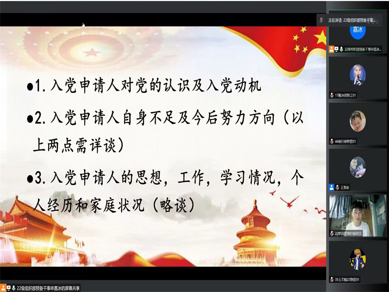 为了进一步了解入党申请人的党性修养和思想觉悟,增强其对党的认识,帮助其端正入党动机,在遵守疫情防控要求的前提下,物流与电商学院学生第一党支部于10月24日下午16:30在腾讯会议上开展了2022年下半年同入党申请人谈话会议,77779193永利官网学生第一党支部书记申作光出席了本次会议,学生第一党支部49名入党申请人参加了本次会议。