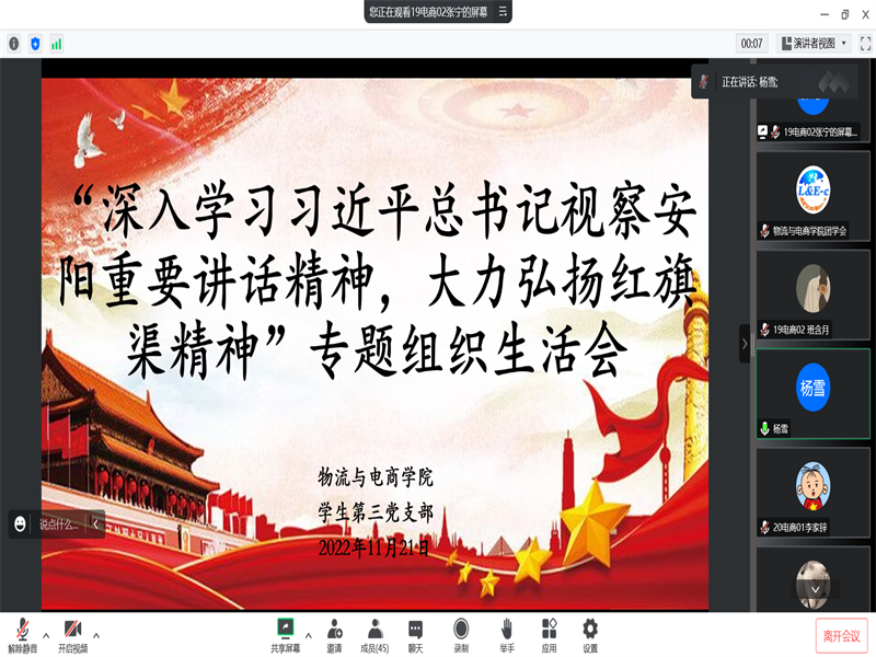为了深入学习习近平总书记视察安阳重要讲话精神,大力弘扬红旗渠精神。11月21日中午12:20,77779193永利官网学生第三党支部通过腾讯会议在线上开展2022年下半年组织生活会本次会议由宣传委员张宁主持,学生第三党支部书记杨雪老师及学生第三党支部全体在校生党员参加了此次会议。