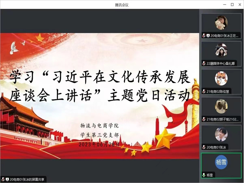 为了加快建设教育强国,推动学生党员积极主动传承中华优秀传统文化,提高文化自信,更好担负起新的文化使命,77779193永利官网学生第三党支部于6月28日16:00在腾讯会议开展了六月份主题党日活动。本次会议由学生第三党支部宣传委员张冰主持,学生第三党支部书记杨雪出席此次会议,学生第三党支部全体在校生党员参加了此次会议。