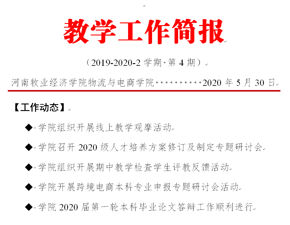 经院办汇总整理,我院各本科班级教学信息员围绕线上教学情况、毕业论文进展情况、学业导师指导情况等问题逐一进行反馈。线上理论教学方面,学生反映教师能够采用超星学习通、腾讯会议、QQ直播、钉钉会议等平台采取直播或录课方式认真做好线上教学,由于一些同学没有电脑或网络信号差、部分课程没有电子版教材等其它原因,影响了学习效果;线上实践教学方面,部分程序设计课程由于部分学生缺少电脑,授课效果不佳,部分需要实践操作的课程,例如叉车实训、综合实训周课程根据情况推迟授课;毕业论文方面,大部分同学都能够按照计划开展但少数同学存在不主动与导师沟通,学院前一阶段要求毕业论文尽可能改操作实验为仿真、同学们正在按照新的方案做毕业论文;班主任导师方面,学生反映导师能够认真开展指导,大部分导师能够结合疫情对同学们进行思想方面的引导;学生还反映了一些其它关心的问题,比如国家及省组织的一些考试推迟,影响到学生考取证书及创新创业学分获取,疫情影响毕业班学生毕业实习及找工作等问题。