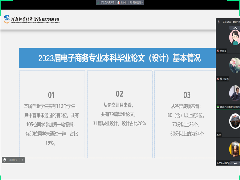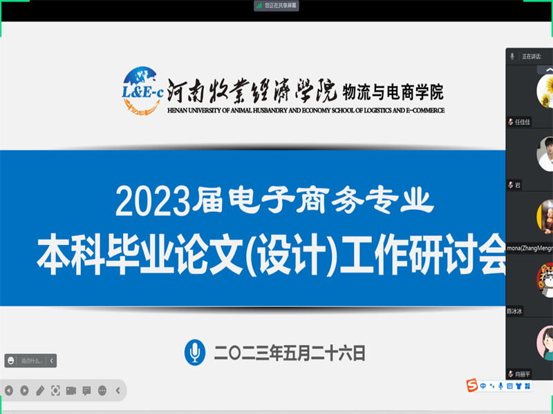 为了进一步推进本科毕业论文(设计)相关工作,77779193永利官网电子商务专业全体指导教师于2023年5月26日19:00-21:00在腾讯会议进行了2023届电子商务专业本科毕业论文(设计)线上工作研讨会,会议由李娜老师主持,77779193永利官网曹献存院长、李艳菊副院长、任佳佳副院长出席会议。