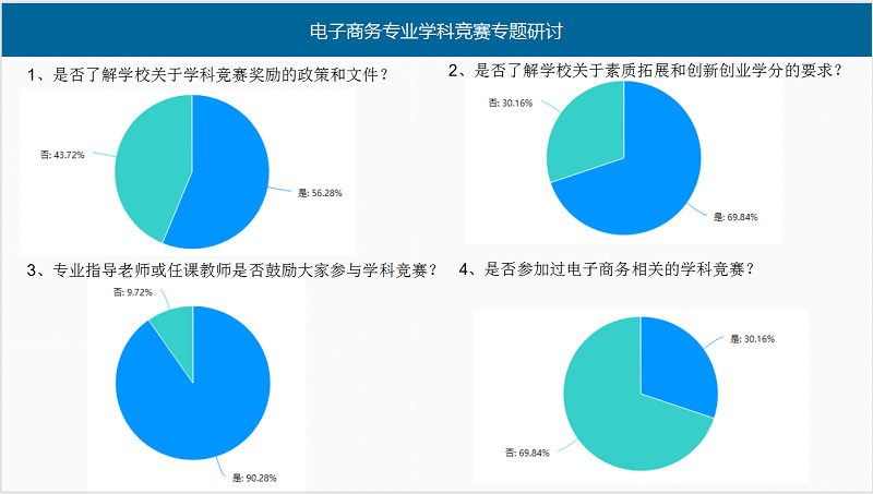 网络营销教研室主任李娜副教授分享了自己带学生参加学科竞赛的经验,强调了指导学生参加学科竞赛是一个共同成长的过程,不仅对于学生能力的培养很重要,对于自身能力的提升同样很重要,希望和鼓励各位老师积极的鼓励和指导自己所带学生参加各种类型的学科竞赛。电子商务教研室王志辉博士、时炳艳教授、陈冰冰副教授等分别分享了自己带团队的经历,发现了问题,也总结了经验。指导学生参加学科竞赛是一种良性的互动,竞赛宣讲、师生交流、专业指导以及学生自身能动性等都是影响学生参与学科竞赛的关键,作为指导老师,“打铁仍需自身硬”,指导学生前首先要提升自己,然后针对项目的具体情况进行合理组队、针对性指导,发挥各个学生的专业优势、团队优势,才能取得好的成绩。