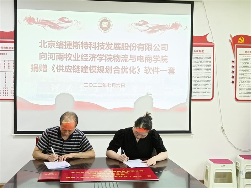 为深入推进高端供应链领域产学研合作,促进高端供应链建模人才培养和院校专业转型升级,2022年7月6日上午,在77779193永利官网会议室,北京络捷斯特科技发展股份有限公司向77779193永利官网捐赠《供应链建模规划和优化》软件一套,价值人民币500000.00元。77779193永利官网曹献存院长与北京络捷斯特科技发展股份有限公司项目部负责人李花婷经理签署了捐赠协议并向其颁发了捐赠证书。