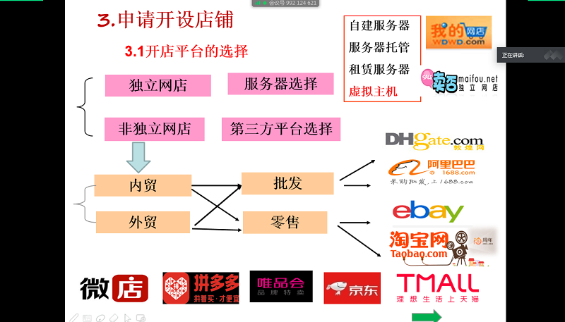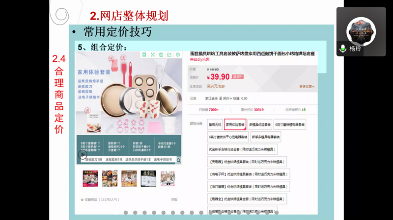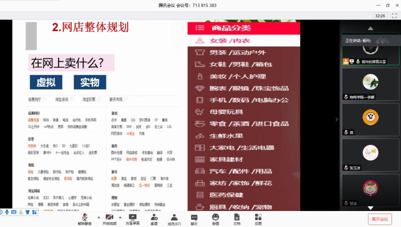 杨玲老师精心准备了此次观摩课,将课程思政、教学方法及多媒体教学手段与教学实际有机融合,在课堂上以网上开店作为主任务启发学生思维、培养学生学习兴趣,同时融入创业创新理念,让听课的师生充分感受到了教师扎实的专业知识、周密的课堂设计以及高超的课堂驾驭的能力。在线课堂上,杨玲将I博导和腾讯会议在线教学工具巧妙结合,通过图文并茂的课件、形象生动的讲解、准确精彩的示范,从网上开店的基础流程入手,系统地讲授了“开店前的准备”、“网店整体规划”、“选择网销商品”、“选择合适平台”、“申请开设店铺”等教学内容。