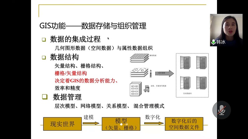 韩冰老师精心准备了此次观摩课,将课程思政、教学方法及多媒体教学手段与教学实际有机融合,在课堂上既重视理论讲解,又启发学生思维、培养学生学习兴趣,让听课的师生充分感受到了教师扎实的专业知识、周密的课堂设计以及高超的课堂驾驭的能力。在线课堂上,韩冰老师将超星学习通和腾讯会议在线教学工具巧妙结合,通过图文并茂的课件、形象生动的讲解、准确精彩的示范,依托地理信息系统应用案例系统地讲授了地理信息系统定义、组成、功能、应用等教学内容。课堂互动气氛活跃,交流热烈。