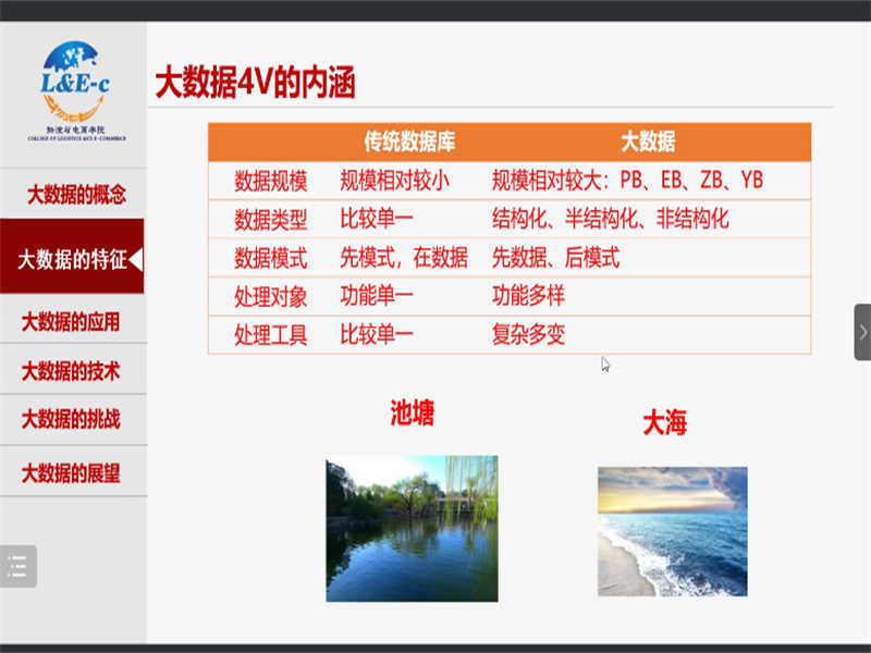 王志辉老师本次示范课的授课主体为20物工01、20物业01的同学。王老师在课前提前告知同学们此次课程的学习目标,并安排课前预习、收集资料等任务,促使学生带着问题来学习。在课堂开始时,王老师通过学习通平台进行签到,保证了课堂100%的出勤率,并运用学习通平台的进行主题讨论,提取词云,及时检查学生资料收集情况与已有知识建构。王老师分别从大数据的概念、特征、应用、技术、挑战、展望等方面进行详细讲授,期间通过课堂讨论、提问等形式引入学生到深度学习,期间巧妙融入课堂思政元素,学教并重。在课程最后,王老师再次通过学习通平台进行课堂测验,及时检查学习效果,并布置课下学习任务,有效延长学习时间。王老师的课堂讲授准备充分,内容丰富,课件精美,思路清晰,语言富有感染力,师生互动良好,能够启发和鼓励学生思考,同时又充分体现了授课教师自身的鲜明特点,充分展示了我院优秀青年教师的教学风采。