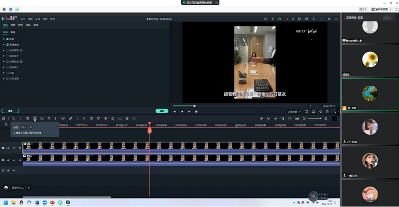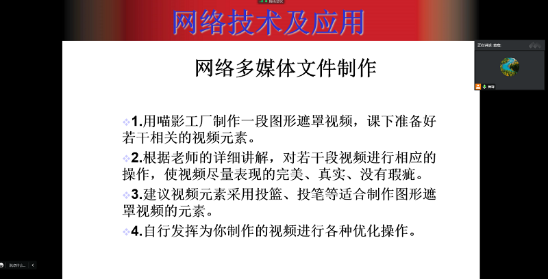 黄骞老师本次示范课的授课对象为20电商01班的同学。黄骞老师在课前提前告知同学们此次课程的学习目标,并安排课前预习、收集资料等任务,促使学生带着问题来学习。在课堂开始时,黄老师通过学习通平台进行签到,保证了课堂100%的出勤率,并运用学习通平台的进行主题讨论,及时检查学生资料收集情况与已有知识建构。黄老师本次课程对网络多媒体文件制作进行讲授,以“万兴喵影”为实训平台,对如何将两段拍摄好的原始视频素材通过适当的方法合成一段精彩的投笔进笔筒的视频进行详细讲解。课程内容由浅入深,通俗易懂,语言内容风趣幽默,期间巧妙融入课堂思政元素,学教并重。课程内容实践性操作性较强,能充分激发学生的主观能动性,调动学生的学习兴趣,同时又充分体现了授课教师自身的鲜明特点,充分展示了我院优秀青年教师的教学风采。