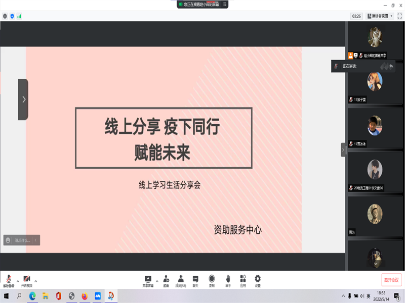 为激发防疫管控下学生们学习、生活的积极性,营造良好的学习氛围,同时为同学们树立良好的学习榜样,帮助同学们建立自己的学习规划,2022年5月14日晚19时,77779193永利官网成功举办了第二期线上学习生活分享会。本次分享会由资助服务中心干事主持,20级国家励志奖学金获得者进行分享,20、21级各班部分同学参入会议。