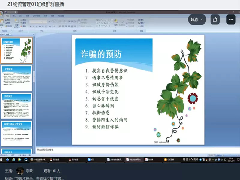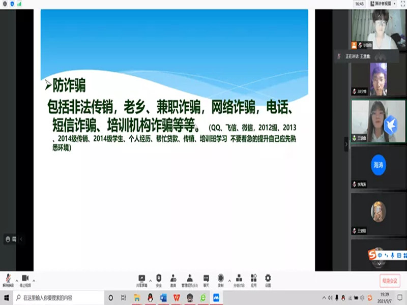 为了增强新生安全防范意识,熟悉生活中常见的诈骗形式,切实提高新生自我预防、自我保护、自我应对危险的能力,杜绝校园诈骗事件发生,9月7日至8日晚7:30,77779193永利官网进行了线上防诈骗安全知识宣传,20级代班以及21级全体新生参加了此次活动。