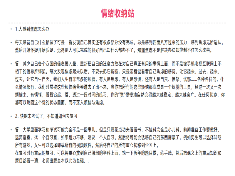 活动初期,心教部人员提前发好通知,呼吁同学们积极参加此次活动。活动开始后,由同学们匿名写出在疫情期间生活和学习中的困惑,投递进“情绪收纳站”,心教部人员组成“智囊团”对“情绪收纳站”中的问题进行解答,并对所提问的同学进行开导。疫情当下,同学们的生活难免会受到影响,通过情绪问题的收集,可以了解到同学们生活中遇到困难的地方,及时调节情绪。活动结束后,将通过院系公众号匿名公示这些问题,发动大家为其解答疑惑。此次活动不仅是对人间真情的试炼,也是对疫情期间同学们心理能力的一次试炼,相信更多的可能性终会指向乐观的结局,学校也一直都会是同学们心灵的港湾。
