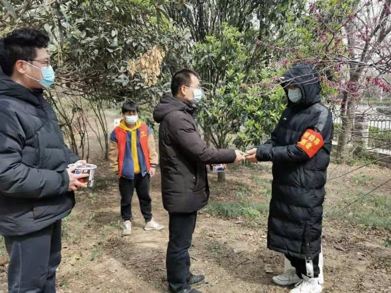 首先陈书记肯定了志愿者们的辛苦付出,对大家为学校疫情防控工作和校园安全稳定所付出的辛勤和汗水表示感谢,并鼓舞大家表示,此阶段为非常时期,希望各位志愿者们能够肩负起责任,有效防范阻止学生的危险性行为。而后,王雪冰老师叮嘱大家在守护校园安全的同时也要加强自身防护,每一次执勤前一定要注意穿衣保暖。随后,老师们向志愿者发放了他们带来的士力架,希望士力架能够给他们带来满满的能量,大家一起坚守岗位、坚定信念、克服困难、再接再厉,为学校疫情防控工作贡献自己的一份力量。