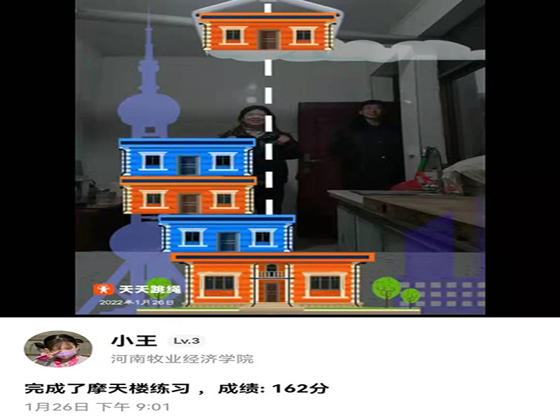生命在于运动,身体是一切活动的保障。坚持体育锻炼不仅可以保持健康,而且可以预防疾病。疫情当前,我院推出“‘疫’起运动”活动,促进同学们坚持体育锻炼,提高身体素质。同学们根据活动要求下载”天天跳绳app“并根据老师发布的作业进行体育锻炼。锻炼方式除100米跑步、开合跳、跳绳等传统运动方式外,新增“切水果”、”吃豆人”、”摩天楼”等各种趣运动。这种锻炼方式可以增加同学们运动中的乐趣,提高运动积极性。