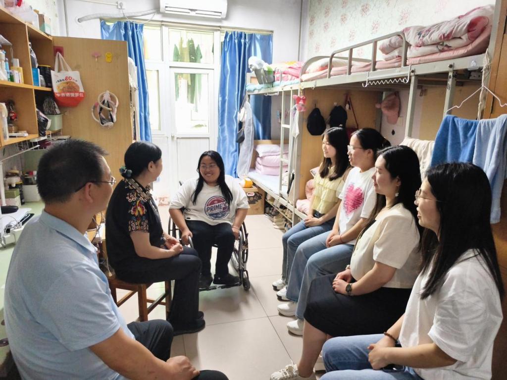 走访人员来到了英才校区2号学生公寓,当走进身残志坚的学生聂盼盼宿舍时,在宿舍的同学都迎了上来,看到聂盼盼同学脸上自信的笑容,师生便开展了亲切的交流,有生活上的,有学习上的,有未来发展规划的.....。田景丽表示,同学同宿舍成员之间要互相帮助,互相爱护,互相鼓励,制定学习目标,共同进步提升;辅导员要多关心了解倾听学生的心声,对困难学生及时救助,使国家、学校的惠民政策惠及到更多学生,不能使任何一个学生因生活困难影响学业;全体学生工作人员要继续发挥学院关注关心关爱学生的优良传统,坚持落实立德树人根本任务,培养更多高素质的社会主义合格建设者和接班人。