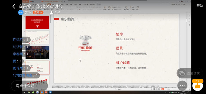 为切实做好毕业生就业创业服务工作,加强我院与企业联系,让毕业生更加深入了解职场信息,明确自我就业方向,11月18日晚七点,我院于钉钉会议群组织开展京东物流华北分公司企业线上专场宣讲会。参加本次宣讲会的有京东物流华北分公司招聘负责人、2021届毕业生以及我院就业创业服务中心工作人员。