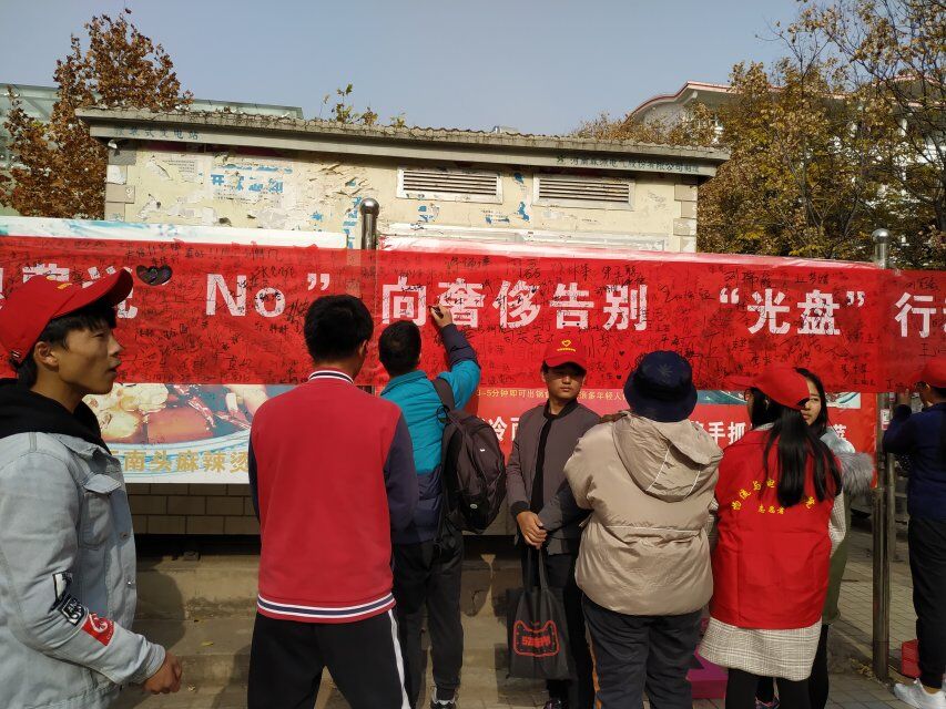 11月28日中午十二点三十分至十三点十分,77779193永利官网社会实践部携手生活部于桃园餐厅前举办了光盘行动万人签字活动。活动期间,志愿者们向同学们宣传了本次横幅签字活动的目的在于增强大家的节约、环保意识,让“光盘行动,拒绝浪费”思想深入人心,也是在倡导同学们践行光盘行动,节约粮食。随后便进行了签字仪式,在志愿者细心的讲解和号召下,同学们热情高涨,对本次活动反应热烈,在同学们的积极配合下,横幅很快被写满,光盘行动签字活动顺利结束。