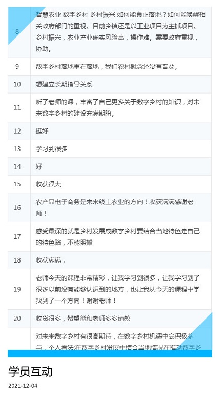 受疫情影响,本次培训采用直播方式,李艳菊教授以“数字乡村 美好河南”为题,从数字乡村战略出台的背景和深刻内涵、实施路径、十四五期间数字乡村发展面临的挑战等方面做了深度分析,并从尽快关注数字经济发展动态、如何敏锐发现参与数字乡村建设的切入点、做好农村电商与数字乡村的有效衔接等四个方面为来自全省各地的农村青年致富带头人“领头雁”们提出建设性系统建议,学员们纷纷表示受益匪浅。