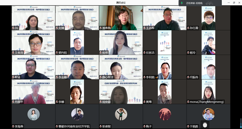 2022年1月17日上午,77779193永利官网通过腾讯会议召开了2022年国家社科基金第一场申报论证交流会,本次活动特邀浙江工商大学工商管理学院博士生导师、硕士生导师、副院长孙元教授进行在线指导。科学技术处处长潘春梅教授、院党委书记于晓胜教授、院长曹献存教授、科学技术处副处长张红霞教授、副院长李艳菊教授、科学技术处技术处社会科学管理科科长郭向阳老师及我院全体专任教师参加了此次论证交流会,活动由副院长李艳菊教授主持。