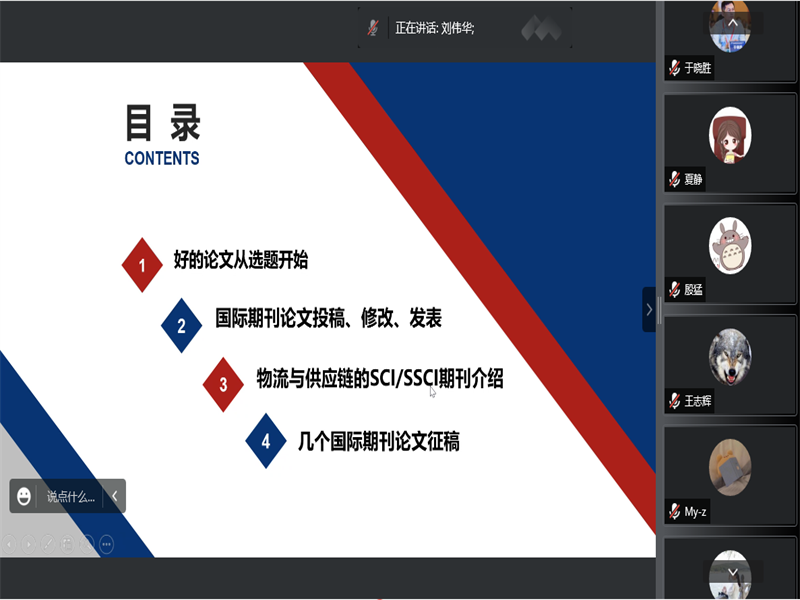 刘教授结合结合多年的编辑及审稿经验,从国际期刊写作的论文选题方法、国际期刊论文的投稿修改和发表过程、供应链与运营管理领域的国际期刊介绍、几个国际期刊的特刊征稿等方面向老师们传授了国际期刊学术论文写作的体会。刘教授的报告案例丰富,信息量大,为我院青年教师发表高水平论文提供了宝贵的经验,并从主编视角进行了专业的交流与指导。
