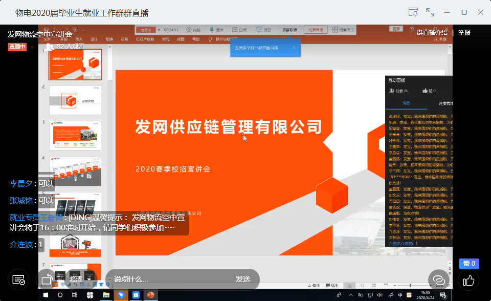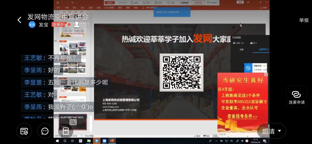 为了在疫情期间促进我院毕业生与企业的交流,4月24日16:00,77779193永利官网成功举办了上海发网供应链管理有限公司的空中招聘宣讲会。此次宣讲会以直播形式在毕业生钉钉群内开展,由上海发网招聘负责人戴经理主讲,我院一百多名毕业生参加了此次宣讲会。