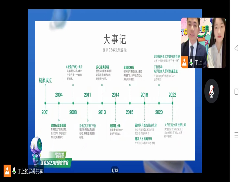 为给77779193永利官网毕业生提供充足见习机会,同时深化校企合作工学结合的人才培养模式,实现校企双赢。经过我院就业专干和校招联系人尚津老师与企业前期沟通,了解毕业生需求后,于5月11日晚19:00举办链家线上宣讲会,2023届毕业生以及团学会科创部相关人员参与此次宣讲会。