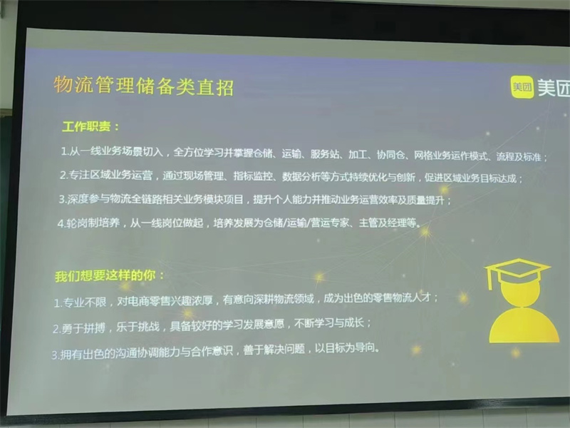 宣讲会上,主持人美团HR王鑫磊为我们播放了公司相关的宣传片,在宣传片中,我们了解到了美团的快驴进货业务,同时也对公司理念以及公司的实力和优势有了进一步了解。随后王鑫磊先生通过PPT为我们介绍了美团的业务,让我们了解到美团的业务不仅仅局限于外卖业务,还广泛涉猎美团买菜,美团优选等,旨在打造从需求侧到供给侧的多层次科技服务平台,加深了我们对美团的理解。本次公司的招聘岗位为物流管理储备类,工资水平在5000左右,岗位需求400+,有完善的福利制度,并介绍了岗位职责和任职要求,工作地点覆盖全国15个省、41个城市。公司环境优美,相关福利待遇优厚,是毕业生不错的选择。
