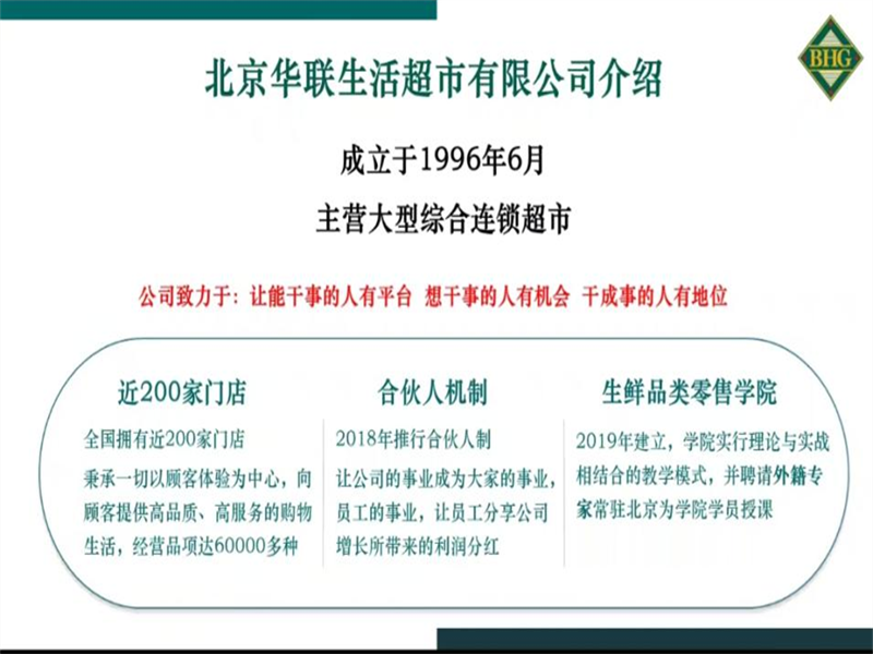 宣讲会正式开始之前,华联人事郭女士为我们播放了公司的宣传视频,让我们对公司有了初步了解:北京华联生活超市有限公司成立于1996年6月,主营大型综合连锁超市,在全国拥有近二百家门店,秉承一切以客户体验为中心,向客户提供高品质、高服务的购物平台。并表示此次招聘岗位为管理培训生,招聘人数为191人,工作地点在贵阳、北京、太原、大连等21座城市,其中生鲜部、采购部、市场部与我院物流管理专业与电子商务专业对口,可供同学们选择。随后郭女士又向我们介绍了公司完善的培训体系,向我们表示出了公司和高层对管培生发展的重视,又通过列举管培生成长案例,让我们对于公司的培训机制以及晋升渠道有了更为深入的了解,接着还为我们展示了公司的内部环境以及福利待遇,公司环境优美,福利保障优厚,是一个不错的选择与工作平台。在最后的答疑环节,郭女士对同学们提出的问题进行一一回答,会议取得圆满结束。