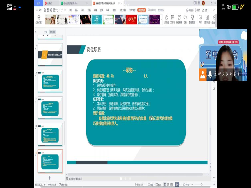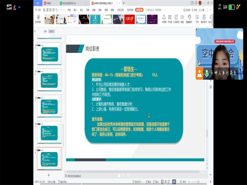 会议伊始,乐畔人事刘莉愿播放了乐畔电子商务有限公司的宣传短片,帮助大家初步了解了乐畔电子商务有限公司。会议上,刘莉愿女士介绍了乐畔从创立至今的发展历程,乐畔电商成立于2013年,目前拥有200余名员工,年交易规模达10亿+,电商行业TOP级服务商。本次招聘共需要20名带货主播(抖音/淘宝),底薪5000-10000+提成。直播场控(抖音)5名,薪资4000-6000+提成。客服(售前/售后)10名,薪资4000-10000。采购1名,薪资4000-7000。管培生10人,薪资4000-10000。河南乐畔电子商务有限公司位于郑州市二七区豫港大厦,地理位置优越,交通便利,为员工提供房源信息,公司环境干净整洁,工作氛围轻松活跃。在答疑环节,招聘负责人对多位毕业生提出的问题进行答疑。通过答疑环节,我院毕业生对该企业工作有了更为全面的认识。