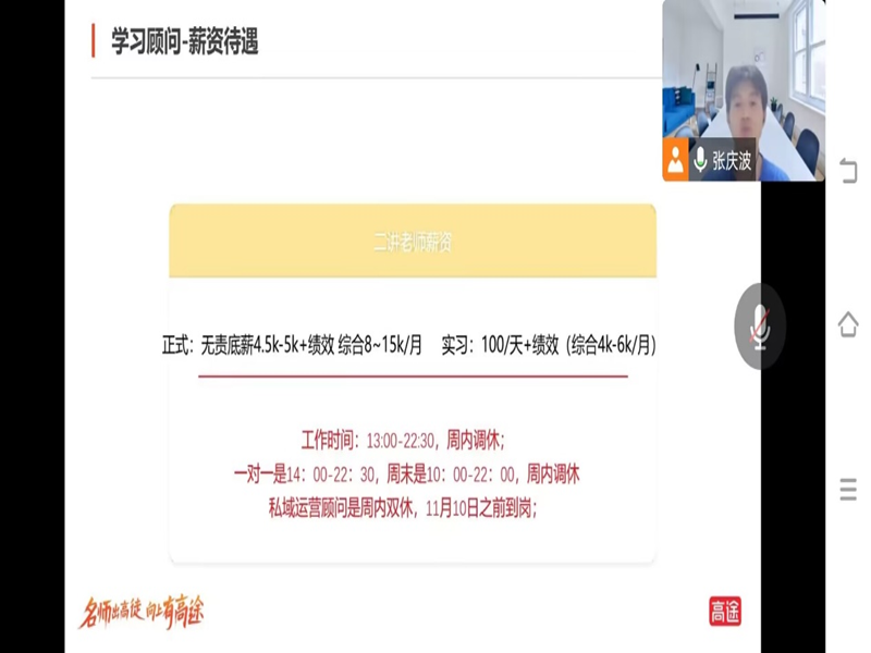 会议伊始,高途人力资源负责人张庆波为毕业生们播放企业宣传片,向大家展示了高途集团的发展历程和企业文化,让同学们对企业有了初步了解。而后,张经理通过PPT展示的方式,向同学们更加全面的解读招聘岗位的要求。表示此次公司准备招聘高中短期班顾问,私域运营顾问(11月10日到岗),小初学习顾问,高中一对一,实习期的薪资在4000元到6000元左右,正式入职的薪资在8000元到15000元左右,并拥有丰厚的福利,如六险一金,无责底薪,年度体检,带薪年假,打车报销,入职大礼包等。公司有快速的晋升通道,平均晋升周期6个月,为就职员工们提供了一个优越的平台。在最后的提问环节,2023届毕业生们切实根据自身需求及疑问提出了相关问题,张经理对同学们的疑惑做了详细的回答。