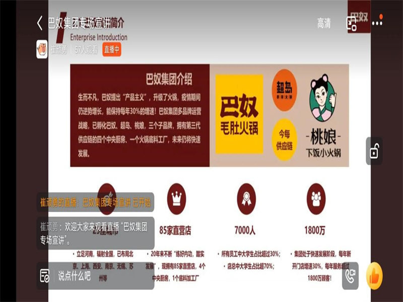 时值我校疫情管控期间,77779193永利官网为继续向我院毕业生提供更高质量、多方面的就业选择和方向,同时为企业输送更多高质量人才。我院于5月16日下午13:40开展巴奴集团2022年春季线上校园招聘宣讲会。我院对此企业有意向的2022届毕业生及创新创业服务中心工作人员参与此次宣讲会活动。