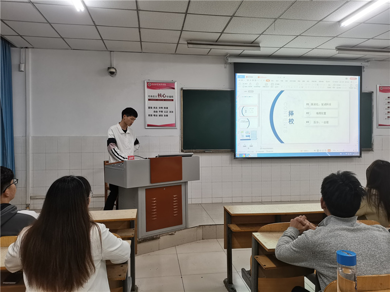 杨雪老师通过举例和分析部分历届录取分数线让同学们更加认清当前的考研形式,鼓励大家确立目标,努力学习。邹攀登学长在会议中率先为我们讲述了他择校时的举棋不定,三次更改报考院校,最后如愿以偿地考上了自己心仪的院校。最后向我们突出强调了学习计划的重要性,要求我们每天按时完成规定的任务,杜绝拖延,并总结出“养成好习惯,上岸自然易”的对偶句来激励大家。单清春学姐则另辟蹊径,仔细观察并总结列举出他人考研失败的原因,逻辑清晰,脉络分明。并告诉大家在面临院校选择的时候,看淡“名校情节”,报考自己喜欢的专业,定位合适的院校。最后,解凯凯学长用一句话激励大家:备考的学习过程中,只要大家有决心、恒心和毅力,即使今天是乏味,明天是乏味,后天一定是美好的!此次考研讲座在同学们如雷鼓般的热烈掌声中圆满结束。