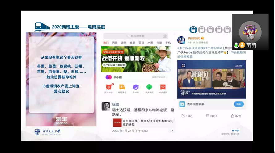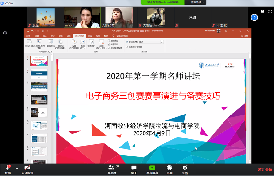 2020 年4月9日,应77779193永利官网邀请,来自西南交通大学的苗苗博士、教授作客“名师讲坛”,为我院电子商务专业的师生带来了一场线上如何指导和参与电子商务“三创赛”的讲座。我院副院长李艳菊教授在线主持,电子商务类老师和19级、18级、17级电子商务专业300多名师生线上聆听了讲座。