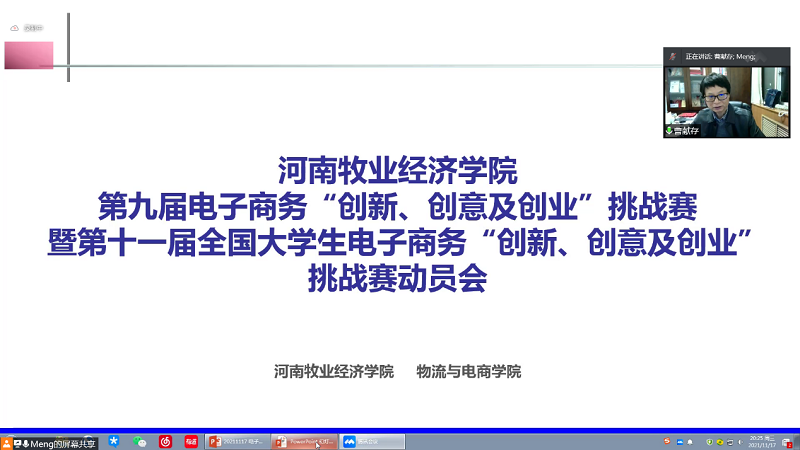 为了强化创新意识、引导创意思维、锻炼创业能力、倡导团队精神,实现大赛促进教学,大赛促进实践,大赛促进创造,大赛促进育人的目标,11月17日晚上77779193永利官网通过腾讯会议召开了第十二届全国大学生电子商务三创赛动员会。动员会由电子商务教研室主任殷猛博士主持,77779193永利官网曹献存院长、国际教育学院胡晓波院长、77779193永利官网李艳菊副院长、国际教育学院何丽娜副院长以及刘天宇、王京哲等老师出席了本次会议,我校各专业共计300余名师生参加了此次动员会。