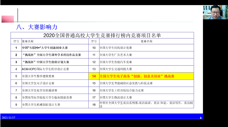 全国大学生电子商务“创新、创意及创业”挑战赛(以下简称三创赛)是在2009年由教育部委托教育部高校电子商务类专业教学指导委员会主办的全国性在校大学生学科性竞赛。根据教育部、财政部(教高函〔2010〕13号)文件精神,三创赛是激发大学生兴趣与潜能,培养大学生创新意识、创意思维、创业能力以及团队协同实战精神的学科性竞赛。大赛在中国高等教育学会发布的全国普通高校大学生竞赛排行榜的57项赛事中排名第14位,是全国广大师生信赖、支持的大赛。