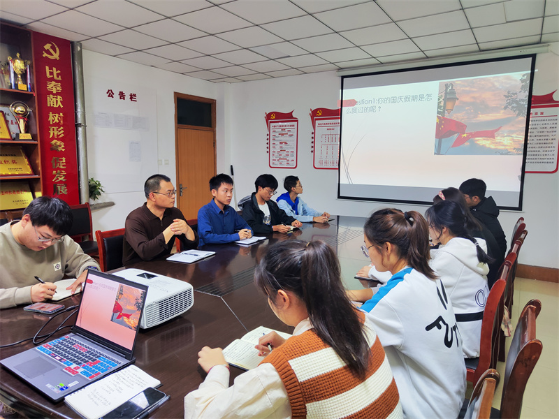 会议伊始,主持人问起了同学们国庆假期是怎么度过的,同学们纷纷发言,回忆起了各自丰富多彩的假期生活。接着,主持人田菊以微辩论“年轻人假期回/不回家”引出了主题,与会同学分别发表自身的看法,有同学认为军训后心神俱疲,迫切地需要回归温馨的家庭怀抱。也有同学认为,假期难得,想要趁这段时间外出旅游、兼职打工或复习功课。主持人对各位同学的踊跃发言表示感谢,并从这场微辩论出发,引出了本次会议的选书——《傅雷家书》,通过作者简介、内容梗概、读者评价三方面向同学们详细介绍了《傅雷家书》。最后,由陈老师作出指导评价。他告诉同学们家庭永远是心灵的港湾,同时也希望同学们不要一直依偎在家庭的怀抱中,要多读书、多见闻,提升思维、思辨能力,拓展眼界,结合专业合理规划目标,努力将小我融入大我,把小家融进大家,在矢志不渝的奋斗中谱写时代新篇章,为祖国的建设与发展奏响时代最强音。
