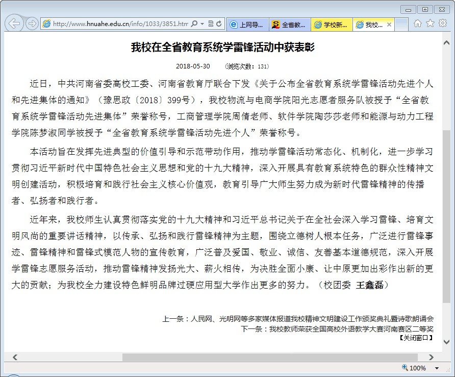 2018年5月被河南省教育系统评为“全省教育系统学雷锋活动先进集体”